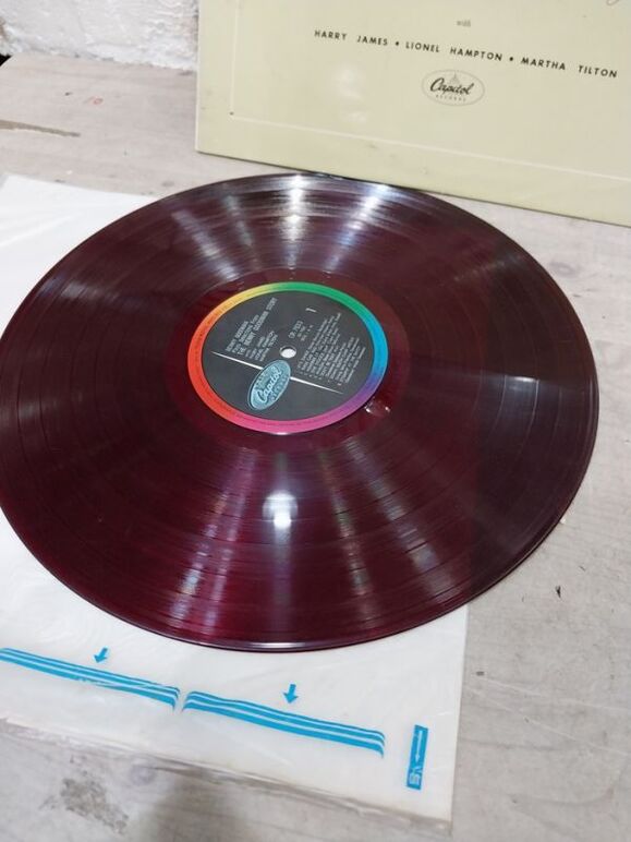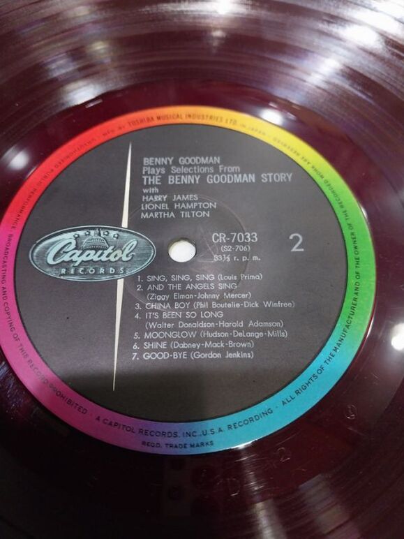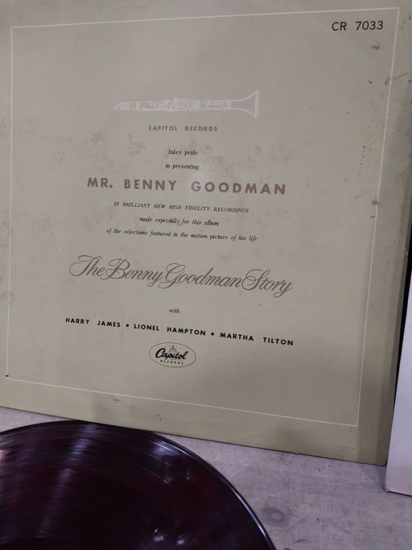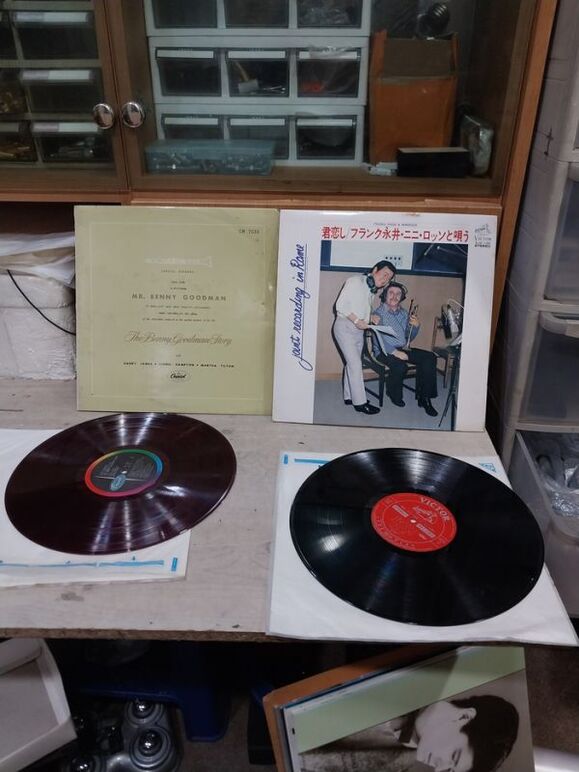 1) 좌측 베니 굿맨은 1950년대 말 혹은 1960년대 초반 일본에서 라이센스 출시된 음반으로써 자줏빛 투명 엘피입니다. 음반 상태는 청음 가능한 수준으로 보시되 위 등급표로는 VG+ 정도로 보시면 됩니다. 자켓은 오염은 좀 있지만 상태 좋고 (EX-) 속지는 있으되 겉비닐은 없습니다.